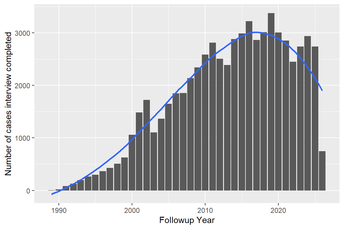 There are 82781 possible followups in the data set. Of those 84% percent were followed successfully (87% if you include centers who had no funding for followup)